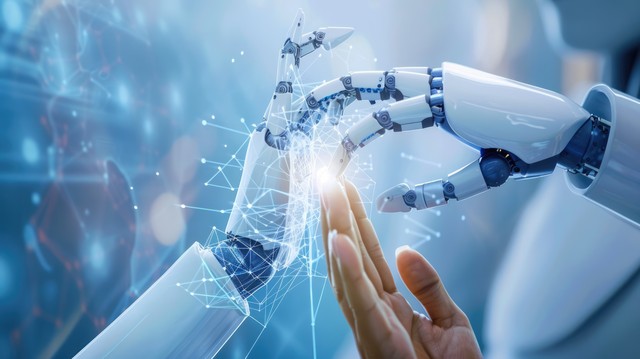 人工智能机器学习——全球网络连接的机器人和人类触摸大数据之手——互联网和数字技术——未来的科学和人工