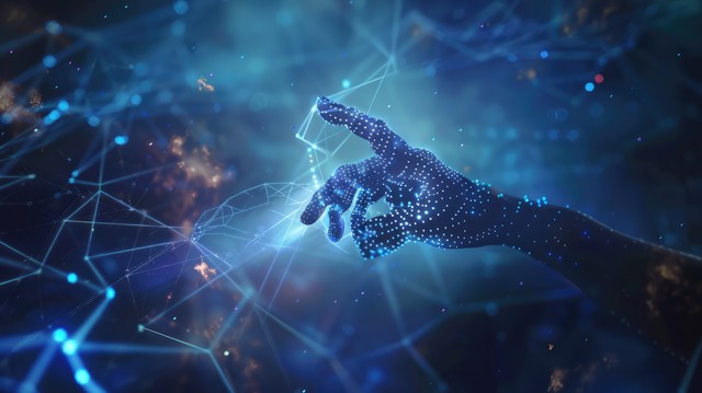 人工智能机器学习——全球网络连接的机器人和人类触摸大数据之手——互联网和数字技术——未来的科学和人工