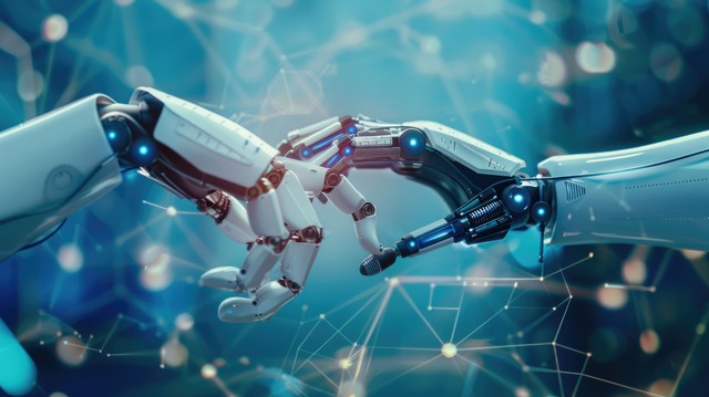 人工智能机器学习——全球网络连接的机器人和人类触摸大数据之手——互联网和数字技术——未来的科学和人工