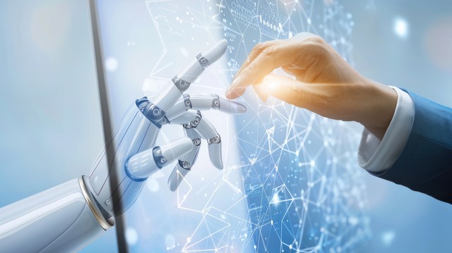 人工智能机器学习——全球网络连接的机器人和人类触摸大数据之手——互联网和数字技术——未来的科学和人工
