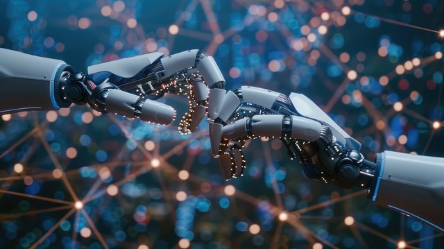 人工智能机器学习——全球网络连接的机器人和人类触摸大数据之手——互联网和数字技术——未来的科学和人工