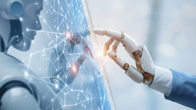 人工智能机器学习——全球网络连接的机器人和人类触摸大数据之手——互联网和数字技术——未来的科学和人工