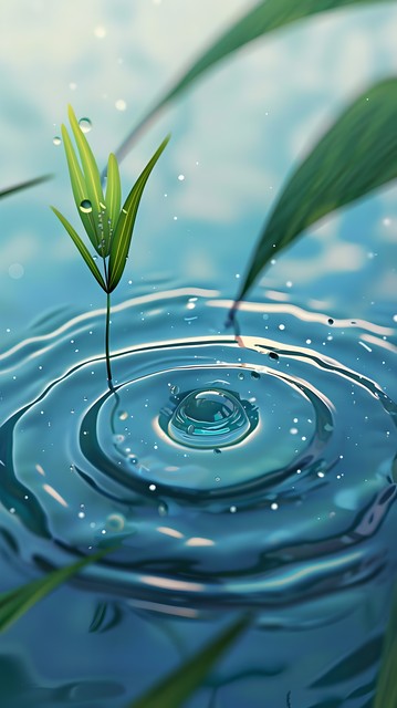 从上方俯视,有一个水滴和一根小草。蓝色场景简单而优雅,水面完美地体现了大自然的和谐。