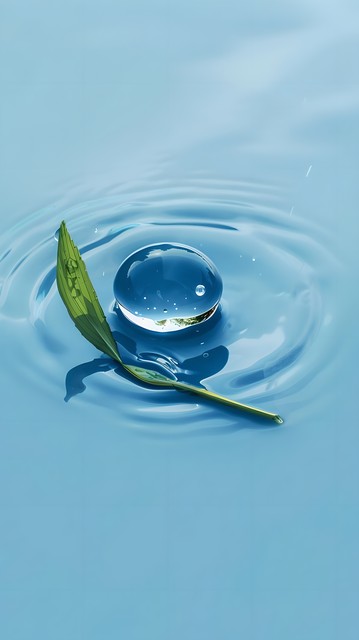 从上方俯视,有一个水滴和一根小草。蓝色场景简单而优雅,水面完美地体现了大自然的和谐。