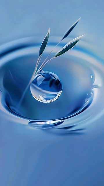 从上方俯视,有一个水滴和一根小草。蓝色场景简单而优雅,水面完美地体现了大自然的和谐。