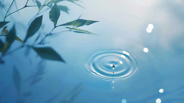 从上方俯视,有一个水滴和一根小草。蓝色场景简单而优雅,水面完美地体现了大自然的和谐。