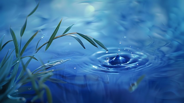 从上方俯视,有一个水滴和一根小草。蓝色场景简单而优雅,水面完美地体现了大自然的和谐。