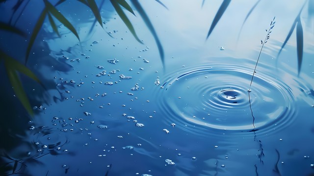 从上方俯视,有一个水滴和一根小草。蓝色场景简单而优雅,水面完美地体现了大自然的和谐。