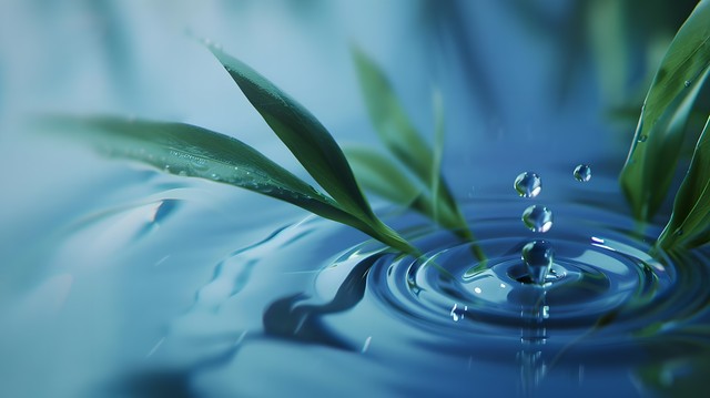 从上方俯视,有一个水滴和一根小草。蓝色场景简单而优雅,水面完美地体现了大自然的和谐。