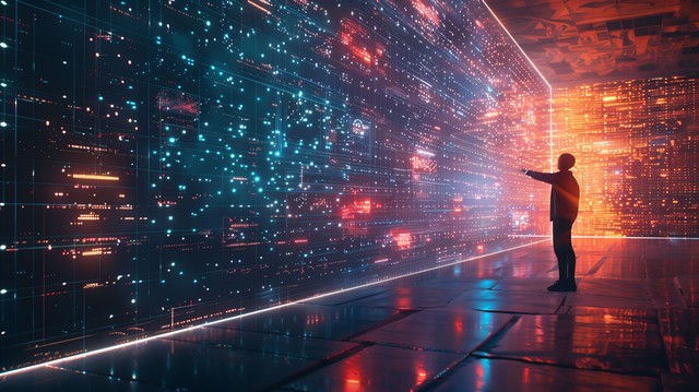 人类科学家研究员3D渲染人工智能研究。计算机大脑的数字数据分析和技术研究背景图