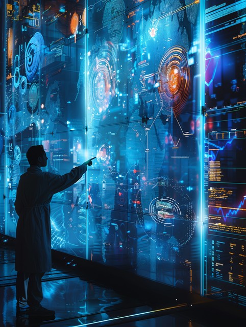 人类科学家研究员3D渲染人工智能研究。计算机大脑的数字数据分析和技术研究背景图