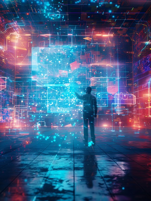 人类科学家研究员3D渲染人工智能研究。计算机大脑的数字数据分析和技术研究背景图