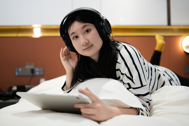 年轻女子放松与音乐和平板电脑在床上