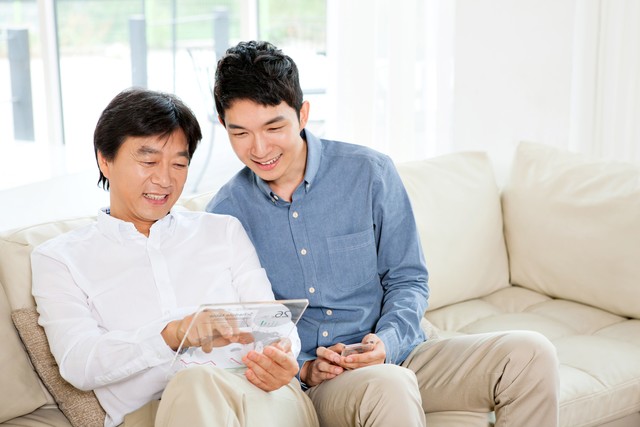 父子在看屏幕时交谈