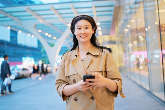 自信的年轻女商人在城市使用智能手机