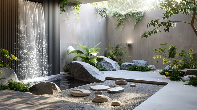 客厅中的自然元素设计,如水景和岩石,增加了宁静和平和感