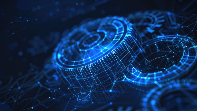 抽象的矢量3d齿轮在黑暗的背景下。齿轮和齿轮机构的概念。数字多边形蓝色网格与点线和形状。机械技术机械