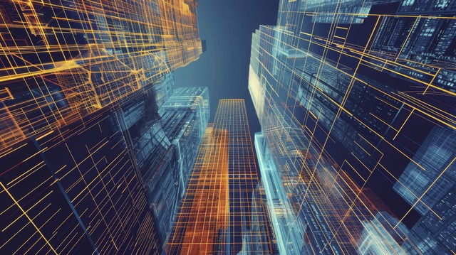 使用线条和数字元素进行抽象 3D 城市渲染。 具有电线纹理的数字摩天大楼。 技术和连接概念。 透视建