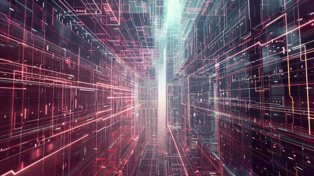 使用线条和数字元素进行抽象 3D 城市渲染。 具有电线纹理的数字摩天大楼。 技术和连接概念。 透视建