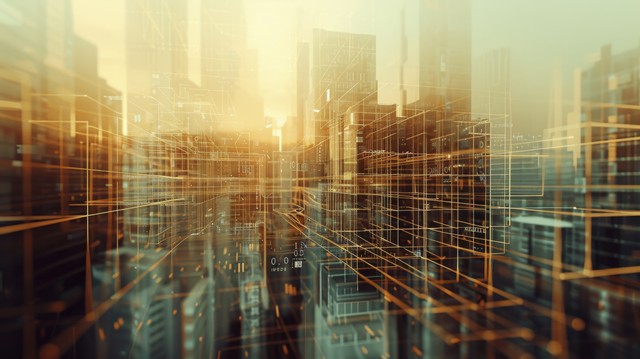 使用线条和数字元素进行抽象 3D 城市渲染。 具有电线纹理的数字摩天大楼。 技术和连接概念。 透视建