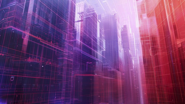 使用线条和数字元素进行抽象 3D 城市渲染。 具有电线纹理的数字摩天大楼。 技术和连接概念。 透视建