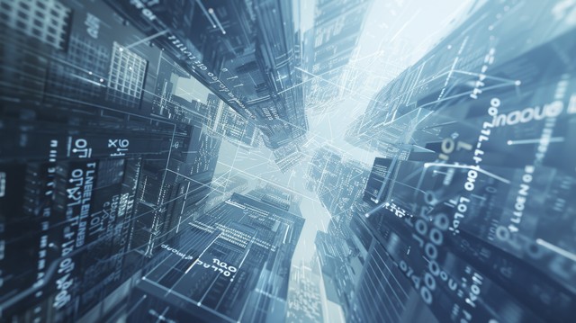 使用线条和数字元素进行抽象 3D 城市渲染。 具有电线纹理的数字摩天大楼。 技术和连接概念。 透视建