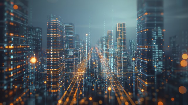 使用线条和数字元素进行抽象 3D 城市渲染。 具有电线纹理的数字摩天大楼。 技术和连接概念。 透视建