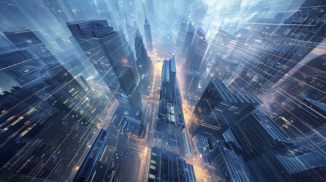 使用线条和数字元素进行抽象 3D 城市渲染。 具有电线纹理的数字摩天大楼。 技术和连接概念。 透视建