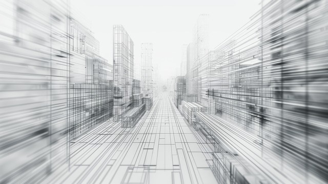 使用线条和数字元素进行抽象 3D 城市渲染。 具有电线纹理的数字摩天大楼。 技术和连接概念。 透视建