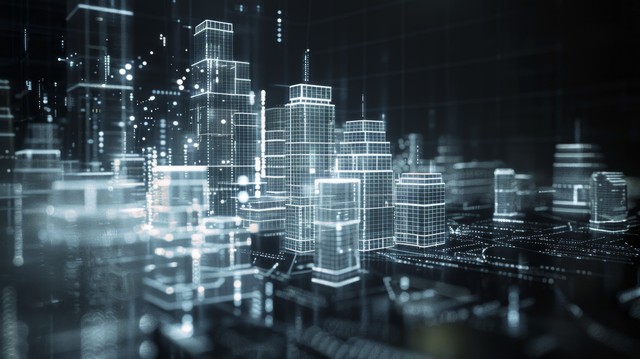 使用线条和数字元素进行抽象 3D 城市渲染。 具有线框纹理和随机数字的摩天大楼。 技术和连接概念。
