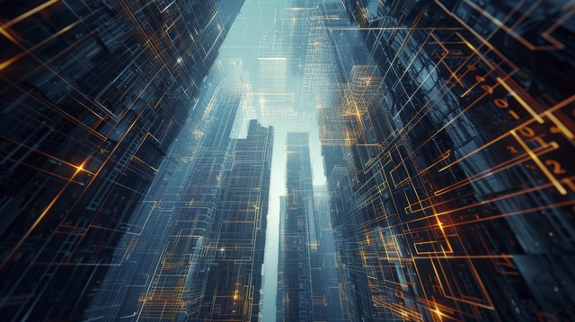 使用线条和数字元素进行抽象 3D 城市渲染。 具有线框纹理和随机数字的摩天大楼。 技术和连接概念。