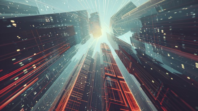 使用线条和数字元素进行抽象 3D 城市渲染。 具有线框纹理和随机数字的摩天大楼。 技术和连接概念。