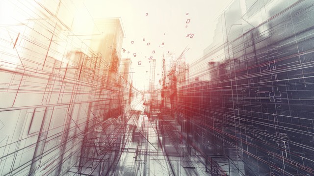 使用线条和数字元素进行抽象 3D 城市渲染。 具有线框纹理和随机数字的摩天大楼。 技术和连接概念。