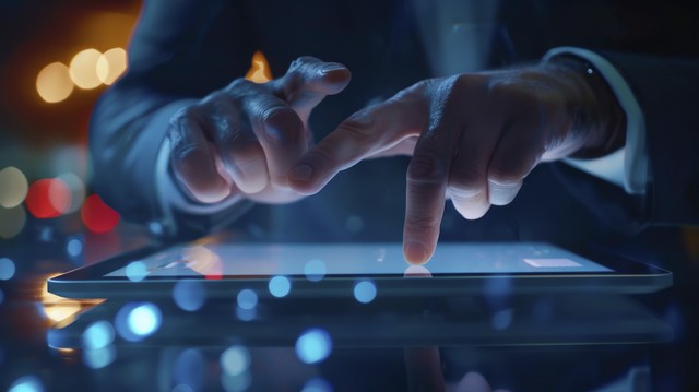 使用现代平板电脑的商人。 网络安全概念。 商业技术和互联网概念。