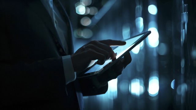 使用现代平板电脑的商人。 网络安全概念。 商业技术和互联网概念。