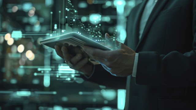 使用现代平板电脑的商人。 网络安全概念。 商业技术和互联网概念。