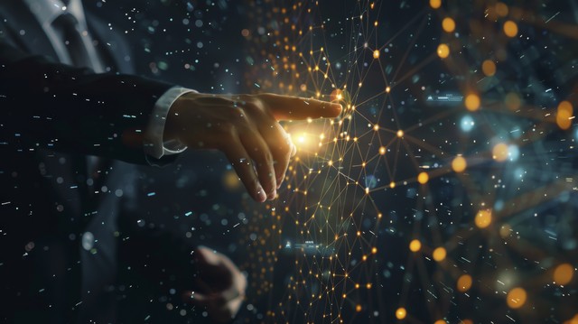 商人触摸指向技术背景上的封闭挂锁现代安全数字背景。 锁定保护系统网络安全和信息或网络保护