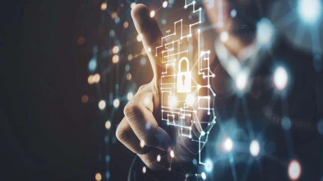 商人触摸指向技术背景上的封闭挂锁现代安全数字背景。 锁定保护系统网络安全和信息或网络保护