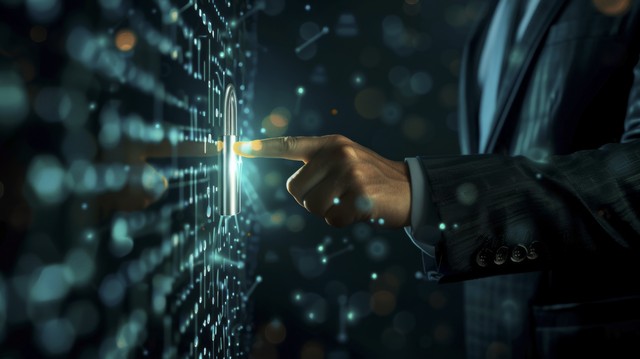 商人触摸指向技术背景上的封闭挂锁现代安全数字背景。 锁定保护系统网络安全和信息或网络保护