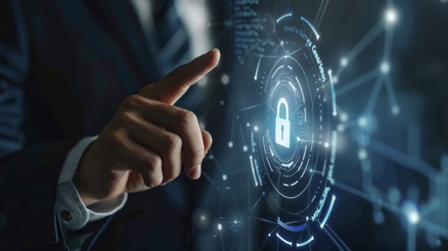 商人触摸指向技术背景上的封闭挂锁现代安全数字背景。 锁定保护系统网络安全和信息或网络保护