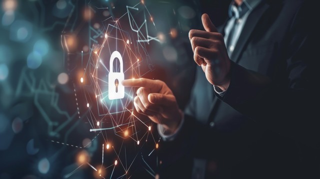 商人触摸指向技术背景上的封闭挂锁现代安全数字背景。 锁定保护系统网络安全和信息或网络保护