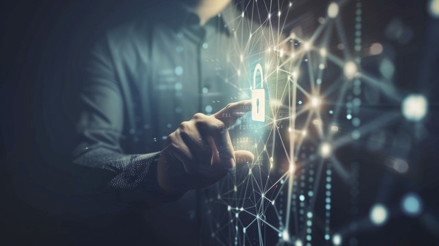 商人触摸指向技术背景上的封闭挂锁现代安全数字背景。 锁定保护系统网络安全和信息或网络保护