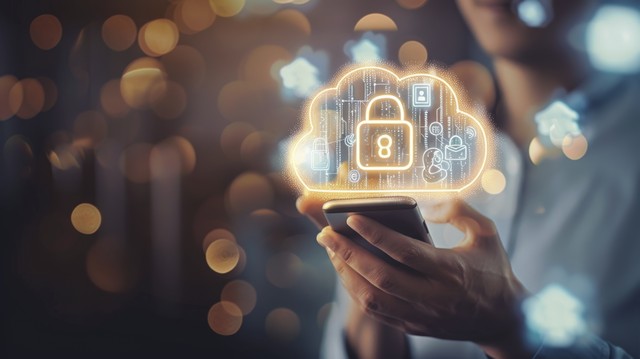 商人触摸指向技术背景上的封闭挂锁现代安全数字背景。 锁定保护系统网络安全和信息或网络保护