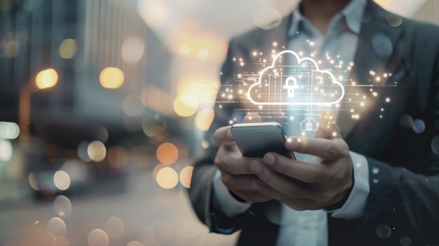 商人触摸指向技术背景上的封闭挂锁现代安全数字背景。 锁定保护系统网络安全和信息或网络保护