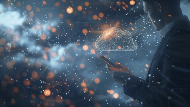 商人触摸指向技术背景上的封闭挂锁现代安全数字背景。 锁定保护系统网络安全和信息或网络保护