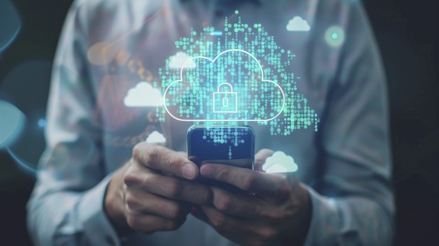 商人触摸指向技术背景上的封闭挂锁现代安全数字背景。 锁定保护系统网络安全和信息或网络保护
