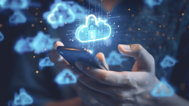 商人触摸指向技术背景上的封闭挂锁现代安全数字背景。 锁定保护系统网络安全和信息或网络保护