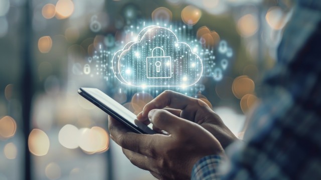 商人触摸指向技术背景上的封闭挂锁现代安全数字背景。 锁定保护系统网络安全和信息或网络保护