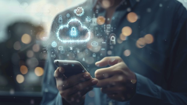 商人触摸指向技术背景上的封闭挂锁现代安全数字背景。 锁定保护系统网络安全和信息或网络保护