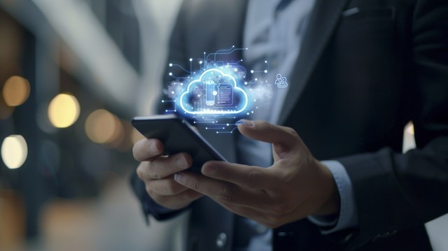 商人触摸指向技术背景上的封闭挂锁现代安全数字背景。 锁定保护系统网络安全和信息或网络保护